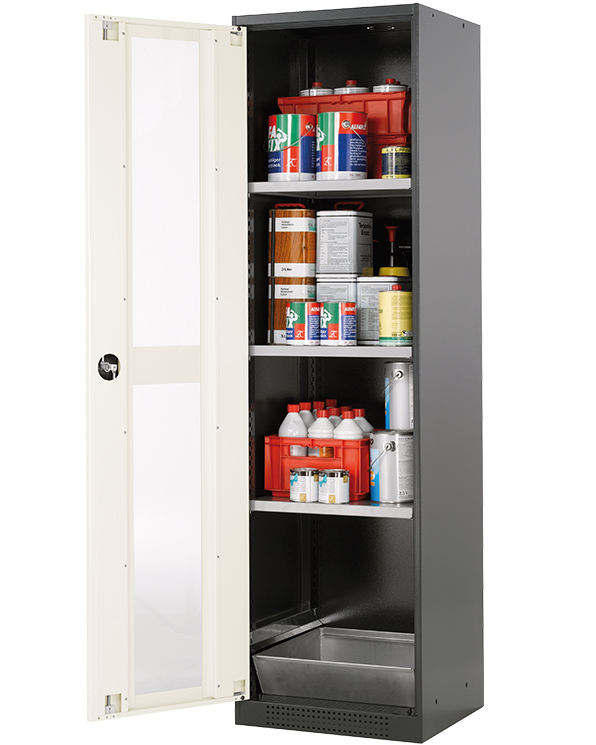 Skåpets färg Antracit grå (RAL 7016), med flygeldörr med glapanel i Ren vit (RAL 9010), inredning med 3 x hylla, 1 x bottentråg (stålplåt galvaniserad)