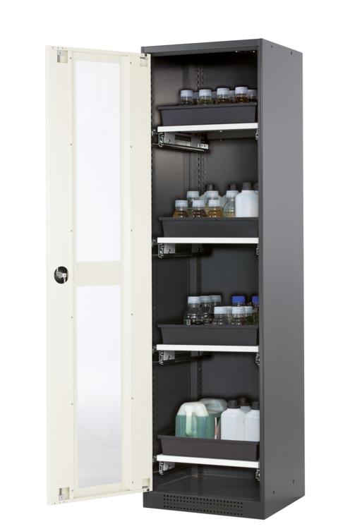 Skåpets färg Antracit grå (RAL 7016), med flygeldörr med glapanel i Ren vit (RAL 9010), inredning med 4 x utdragbar hylla (stålplåt/polypropen pulverlackerad)