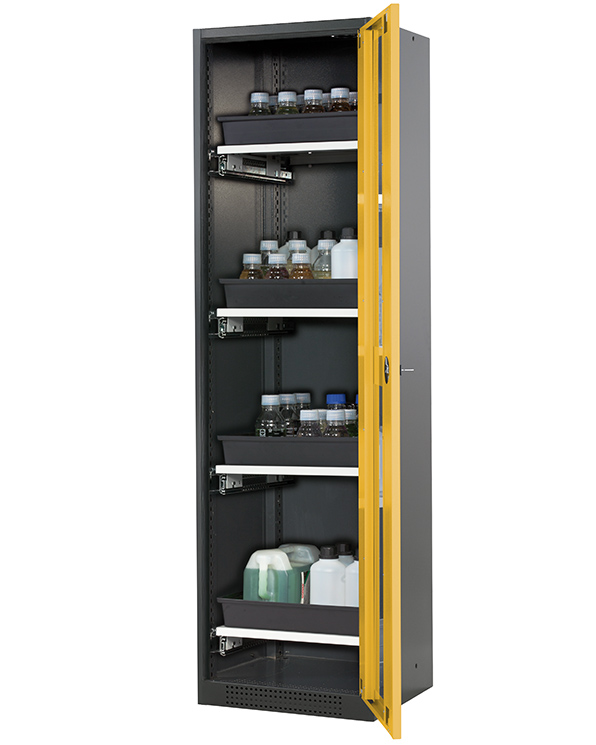 Skåpets färg Antracit grå (RAL 7016), med flygeldörr med glapanel i Varning gul (RAL 1004), inredning med 4 x utdragbar hylla (stålplåt/polypropen pulverlackerad)