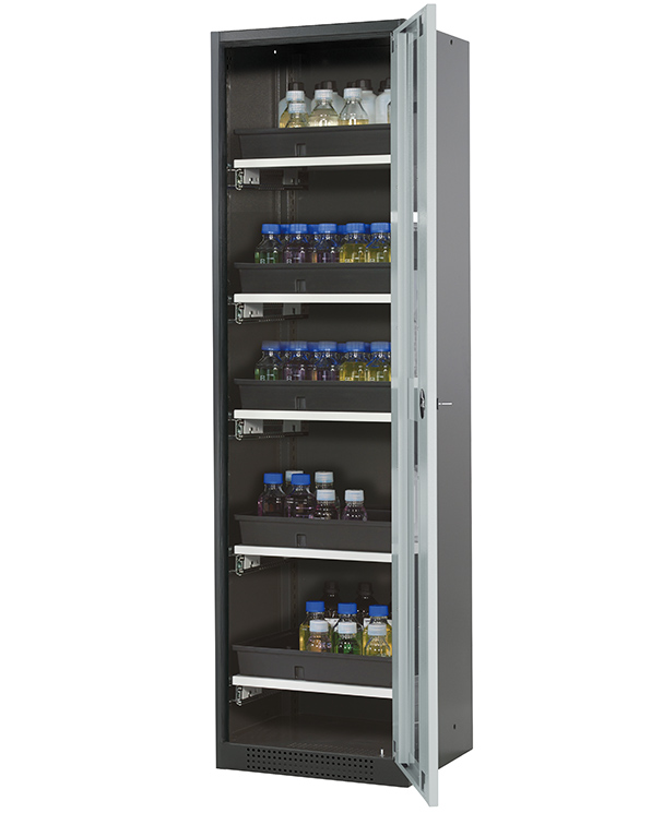Skåpets färg Antracit grå (RAL 7016), med flygeldörr med glapanel i ljusgrå (RAL 7035), inredning med 5 x utdragbar hylla (stålplåt/polypropen pulverlackerad)