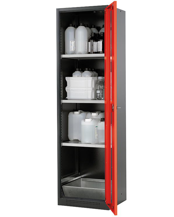Skåpets färg Antracit grå (RAL 7016), med flygeldörr med glapanel i Trafikröd (RAL 3020), inredning med 3 x hylla, 1 x bottentråg (stålplåt galvaniserad)