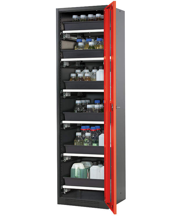 Skåpets färg Antracit grå (RAL 7016), med flygeldörr med glapanel i Trafikröd (RAL 3020), inredning med 6 x utdragbar hylla (stålplåt/polypropen pulverlackerad)