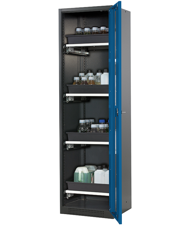 Skåpets färg Antracit grå (RAL 7016), med flygeldörr med glapanel i gentiana blå (RAL 5010), inredning med 4 x utdragbar hylla (stålplåt/polypropen pulverlackerad)