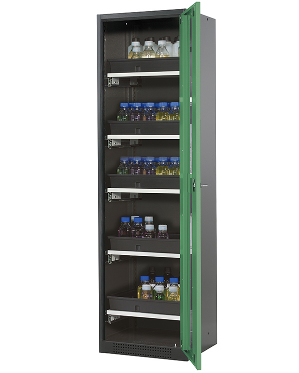 Skåpets färg Antracit grå (RAL 7016), med flygeldörr med glapanel i Reseda grön (RAL 6011), inredning med 5 x utdragbar hylla (stålplåt/polypropen pulverlackerad)