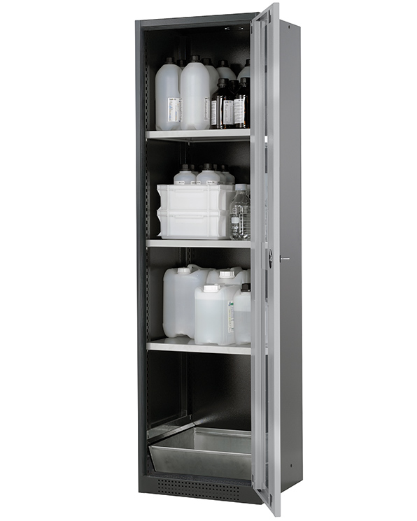 Skåpets färg Antracit grå (RAL 7016), med flygeldörr med glapanel i asecos silver, inredning med 3 x hylla, 1 x bottentråg (stålplåt galvaniserad)