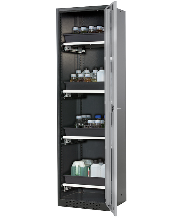 Skåpets färg Antracit grå (RAL 7016), med flygeldörr med glapanel i asecos silver, inredning med 4 x utdragbar hylla (stålplåt/polypropen pulverlackerad)