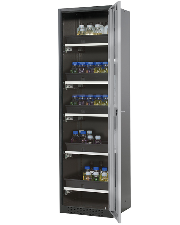 Skåpets färg Antracit grå (RAL 7016), med flygeldörr med glapanel i asecos silver, inredning med 5 x utdragbar hylla (stålplåt/polypropen pulverlackerad)