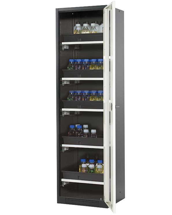 Skåpets färg Antracit grå (RAL 7016), med flygeldörr med glapanel i Ren vit (RAL 9010), inredning med 5 x utdragbar hylla (stålplåt/polypropen pulverlackerad)