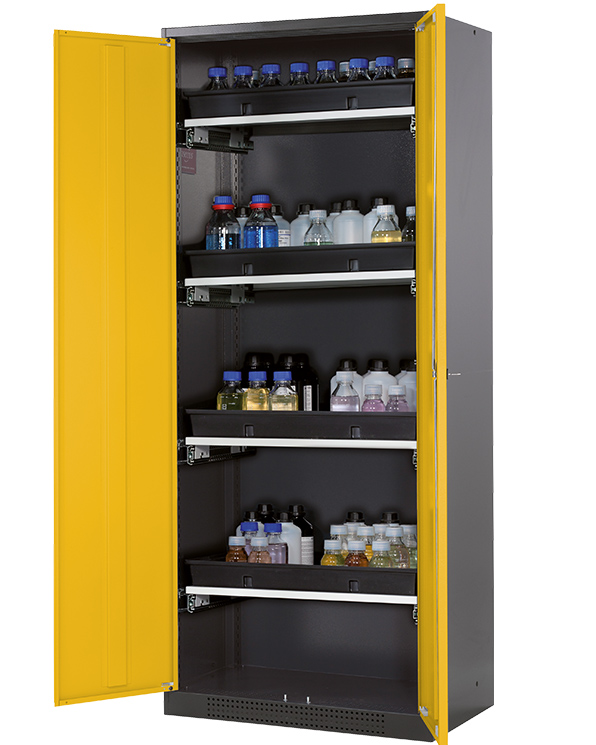 Skåpets färg Antracit grå (RAL 7016), med flygeldörrar i Varning gul (RAL 1004), inredning med 4 x utdragbar hylla (stålplåt/polypropen pulverlackerad)