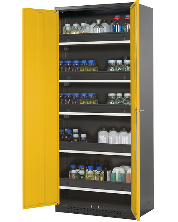 Skåpets färg Antracit grå (RAL 7016), med flygeldörrar i Varning gul (RAL 1004), inredning med 5 x utdragbar hylla (stålplåt/polypropen pulverlackerad)