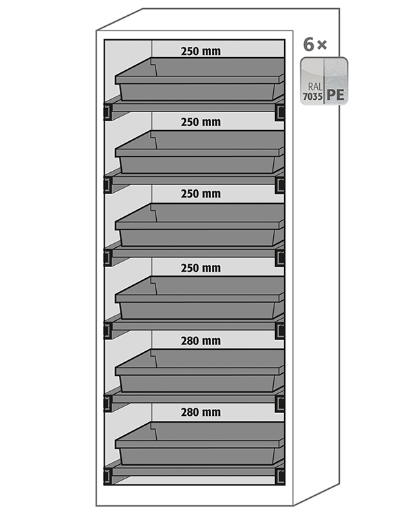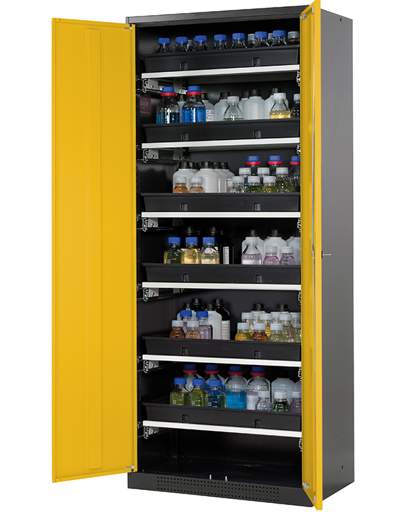 Skåpets färg Antracit grå (RAL 7016), med flygeldörrar i Varning gul (RAL 1004), inredning med 6 x utdragbar hylla (stålplåt/polypropen pulverlackerad)