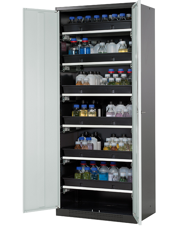 Skåpets färg Antracit grå (RAL 7016), med flygeldörrar i ljusgrå (RAL 7035), inredning med 6 x utdragbar hylla (stålplåt/polypropen pulverlackerad)