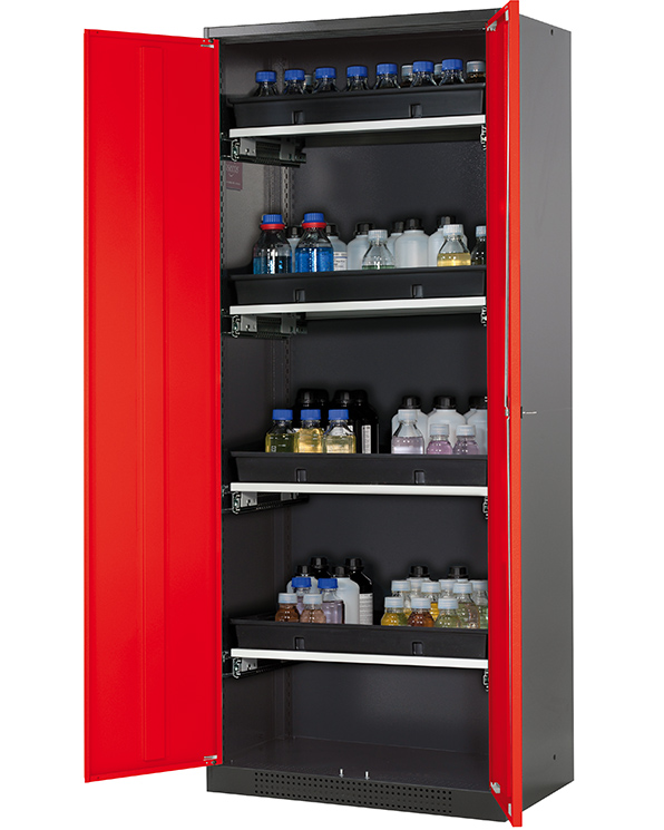Skåpets färg Antracit grå (RAL 7016), med flygeldörrar i Trafikröd (RAL 3020), inredning med 4 x utdragbar hylla (stålplåt/polypropen pulverlackerad)