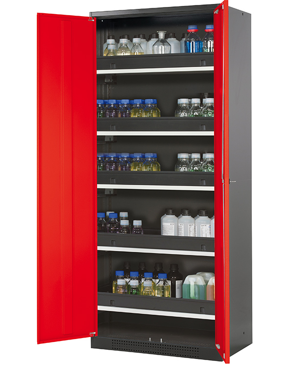 Skåpets färg Antracit grå (RAL 7016), med flygeldörrar i Trafikröd (RAL 3020), inredning med 5 x utdragbar hylla (stålplåt/polypropen pulverlackerad)