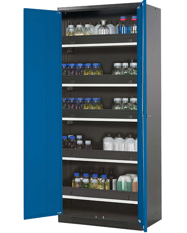 Skåpets färg Antracit grå (RAL 7016), med flygeldörrar i gentiana blå (RAL 5010), inredning med 5 x utdragbar hylla (stålplåt/polypropen pulverlackerad)