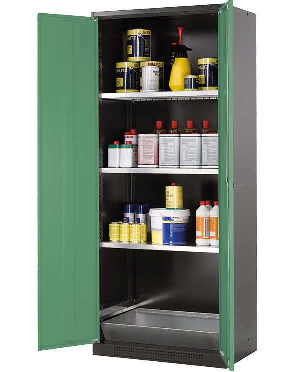 Skåpets färg Antracit grå (RAL 7016), med flygeldörrar i Reseda grön (RAL 6011), inredning med 3 x hylla, 1 x bottentråg (stålplåt galvaniserad)