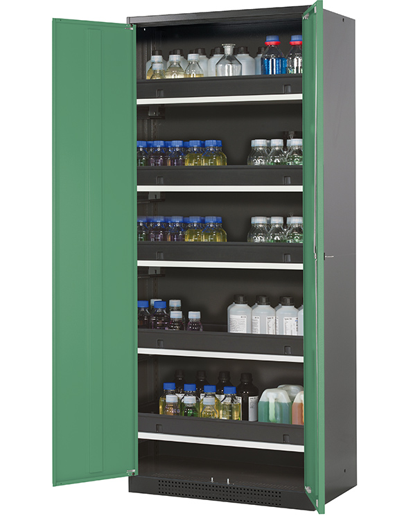 Skåpets färg Antracit grå (RAL 7016), med flygeldörrar i Reseda grön (RAL 6011), inredning med 5 x utdragbar hylla (stålplåt/polypropen pulverlackerad)