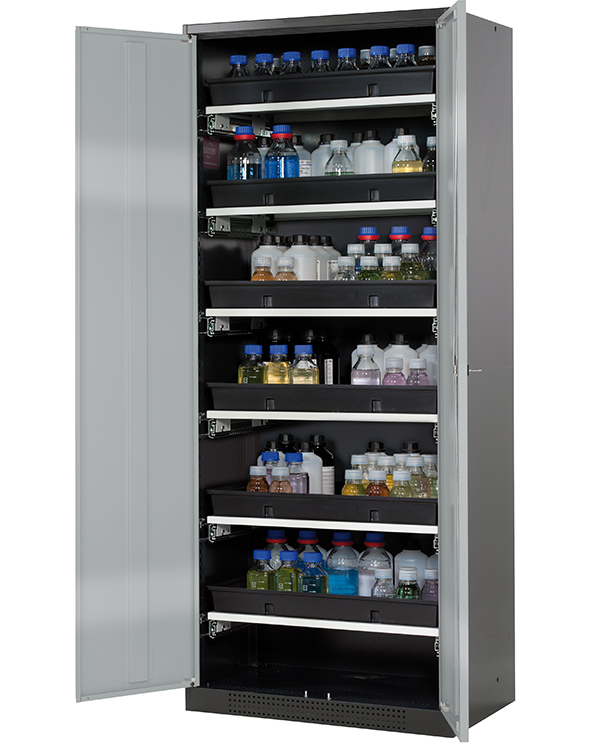 Skåpets färg Antracit grå (RAL 7016), med flygeldörrar i asecos silver, inredning med 6 x utdragbar hylla (stålplåt/polypropen pulverlackerad)
