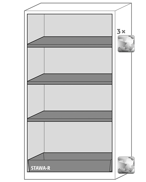 Skåpets färg Antracit grå (RAL 7016), med flygeldörrar i ljusgrå (RAL 7035), inredning med 3 x hylla, 1 x bottentråg (stålplåt galvaniserad)