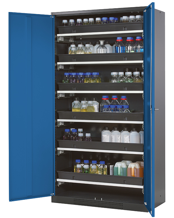 Skåpets färg Antracit grå (RAL 7016), med flygeldörrar i gentiana blå (RAL 5010), inredning med 6 x utdragbar hylla (stålplåt/polypropen pulverlackerad)