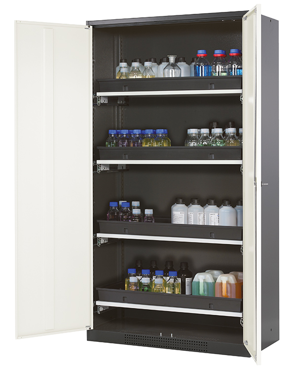 Skåpets färg Antracit grå (RAL 7016), med flygeldörrar i Ren vit (RAL 9010), inredning med 4 x utdragbar hylla (stålplåt/polypropen pulverlackerad)