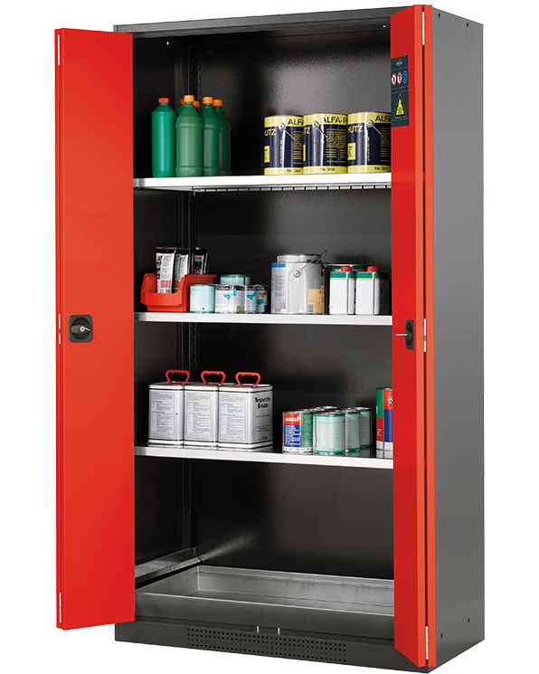 Skåpets färg Antracit grå (RAL 7016), med flygeldörrar i Trafikröd (RAL 3020), inredning med 3 x hylla, 1 x bottentråg (stålplåt galvaniserad)