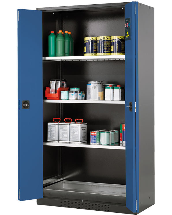 Skåpets färg Antracit grå (RAL 7016), med flygeldörrar i gentiana blå (RAL 5010), inredning med 3 x hylla, 1 x bottentråg (stålplåt galvaniserad)