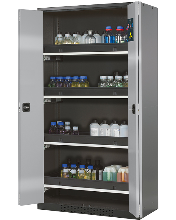 Skåpets färg Antracit grå (RAL 7016), med flygeldörrar i asecos silver, inredning med 4 x utdragbar hylla (stålplåt/polypropen pulverlackerad)