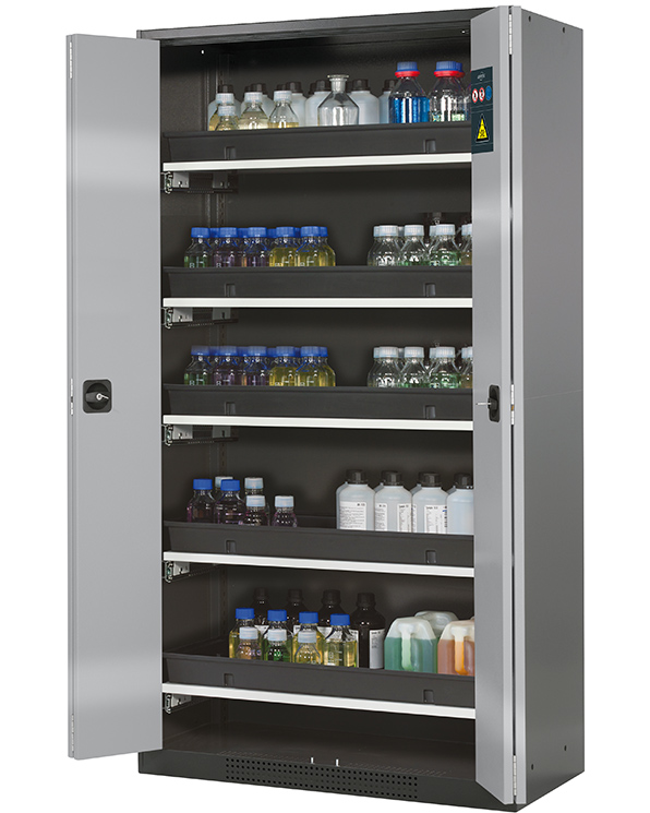 Skåpets färg Antracit grå (RAL 7016), med flygeldörrar i asecos silver, inredning med 5 x utdragbar hylla (stålplåt/polypropen pulverlackerad)