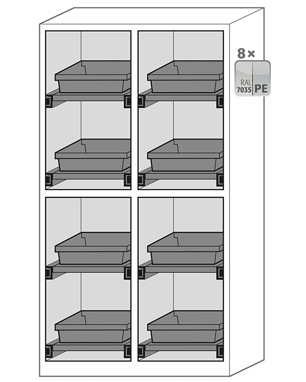 Skåpets färg Antracit grå (RAL 7016), med flygeldörrar i Ren vit (RAL 9010), inredning med 8 x utdragbar hylla (stålplåt/polypropen pulverlackerad)