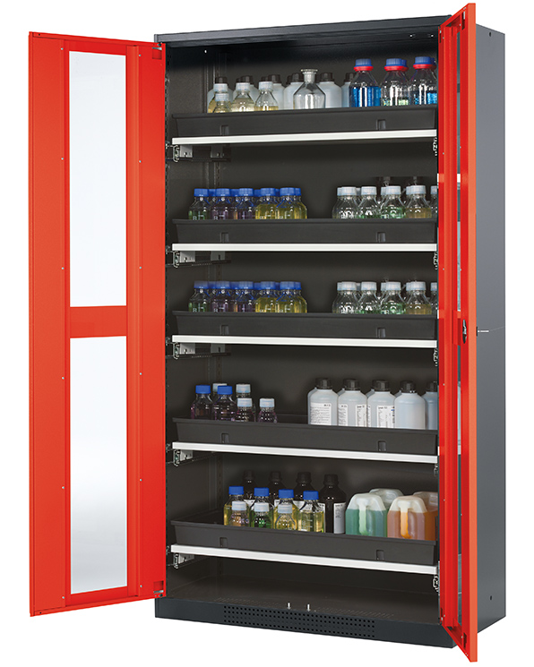 Skåpets färg Antracit grå (RAL 7016), med flygelörrar med glaspanel i Trafikröd (RAL 3020), inredning med 5 x utdragbar hylla (stålplåt/polypropen pulverlackerad)