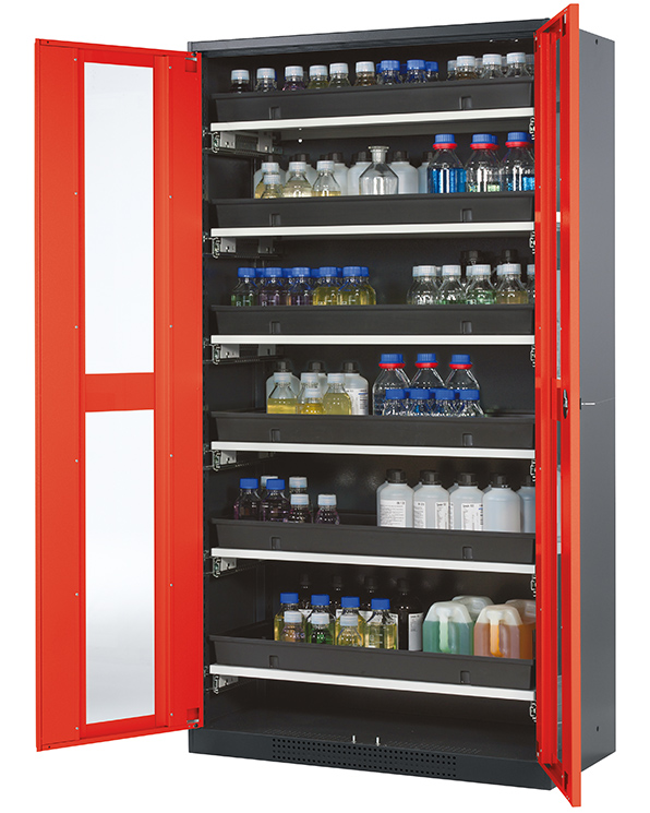 Skåpets färg Antracit grå (RAL 7016), med flygelörrar med glaspanel i Trafikröd (RAL 3020), inredning med 6 x utdragbar hylla (stålplåt/polypropen pulverlackerad)