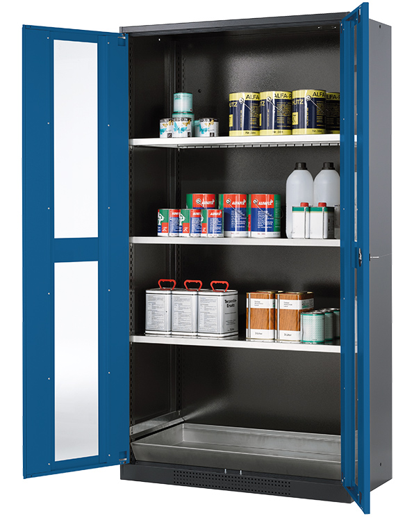 Skåpets färg Antracit grå (RAL 7016), med flygelörrar med glaspanel i gentiana blå (RAL 5010), inredning med 3 x hylla, 1 x bottentråg (stålplåt galvaniserad)