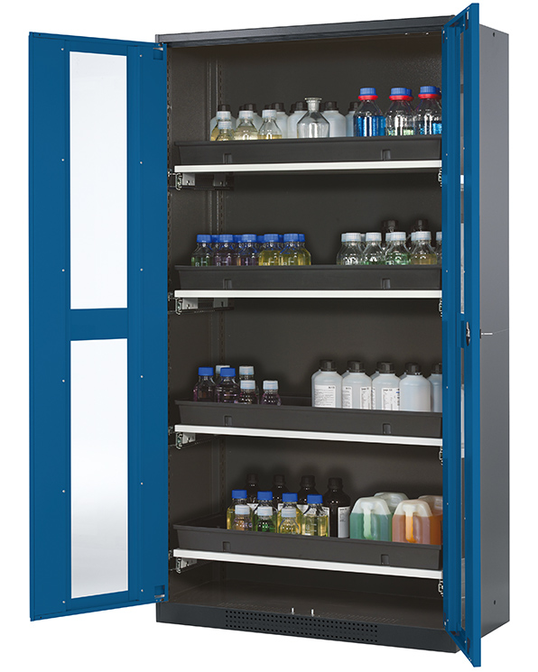 Skåpets färg Antracit grå (RAL 7016), med flygelörrar med glaspanel i gentiana blå (RAL 5010), inredning med 4 x utdragbar hylla (stålplåt/polypropen pulverlackerad)
