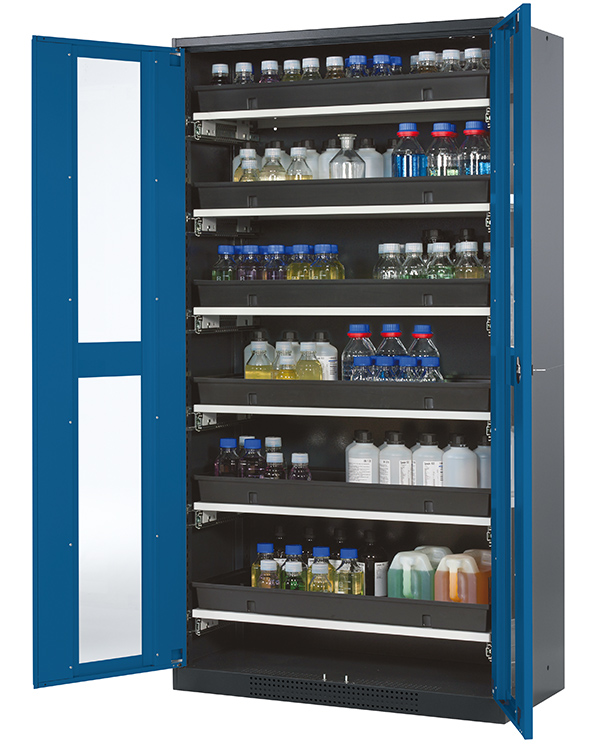 Skåpets färg Antracit grå (RAL 7016), med flygelörrar med glaspanel i gentiana blå (RAL 5010), inredning med 6 x utdragbar hylla (stålplåt/polypropen pulverlackerad)