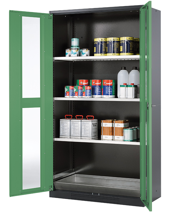 Skåpets färg Antracit grå (RAL 7016), med flygelörrar med glaspanel i Reseda grön (RAL 6011), inredning med 3 x hylla, 1 x bottentråg (stålplåt galvaniserad)