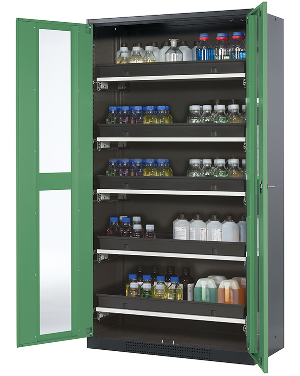 Skåpets färg Antracit grå (RAL 7016), med flygelörrar med glaspanel i Reseda grön (RAL 6011), inredning med 5 x utdragbar hylla (stålplåt/polypropen pulverlackerad)