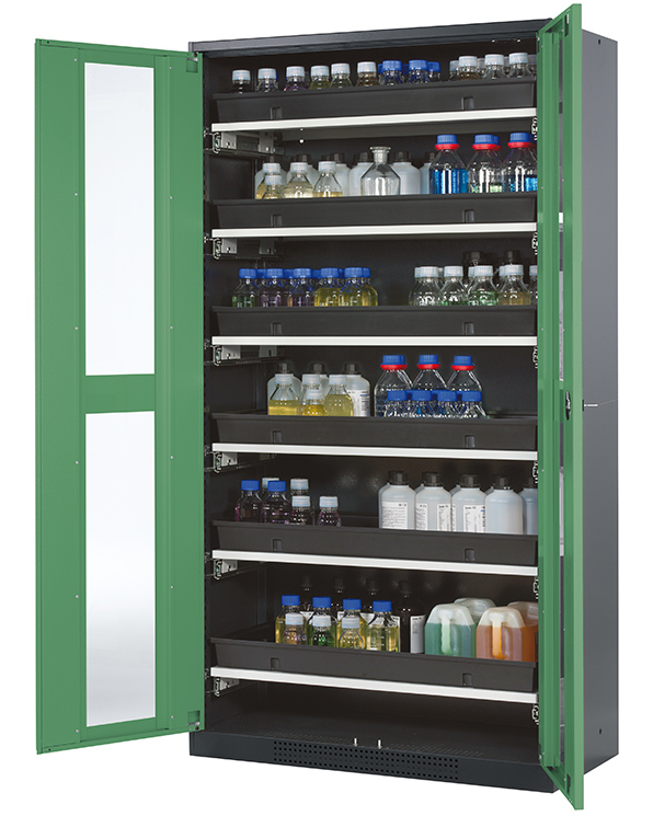 Skåpets färg Antracit grå (RAL 7016), med flygelörrar med glaspanel i Reseda grön (RAL 6011), inredning med 6 x utdragbar hylla (stålplåt/polypropen pulverlackerad)