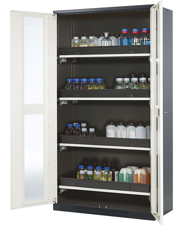Skåpets färg Antracit grå (RAL 7016), med flygelörrar med glaspanel i Ren vit (RAL 9010), inredning med 4 x utdragbar hylla (stålplåt/polypropen pulverlackerad)