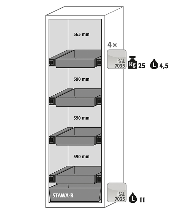 ljusgrå (RAL 7035), inredning med 4 x draglåda, 1 x bottentråg (stålplåt pulverlackerad)
